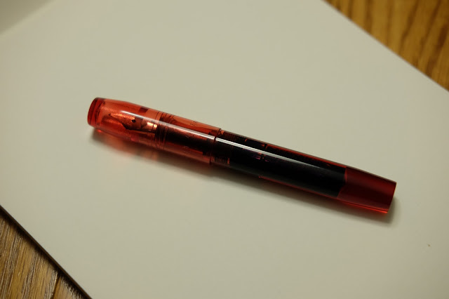 Currently offered are the tiger, amber, and cherry-ice models. I chose cherry ice because I already have an orange pen, and who doesn't love grenadine? This is definitely my Shirley Temple pen which looks and somewhat tastes like that drink whenever I touch it. It's a short pocket pen, and does not have a clip which causes it to roll on my table since my house seems slightly at a slant.
